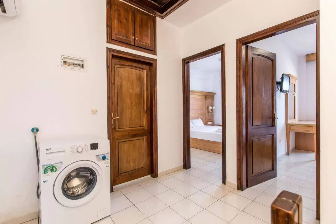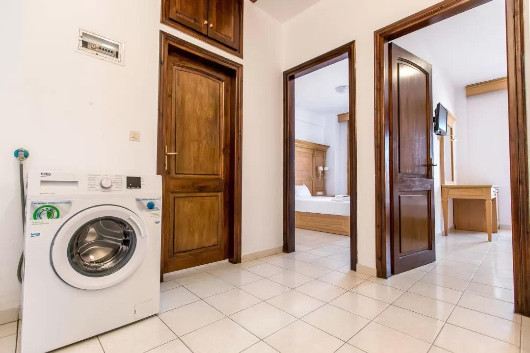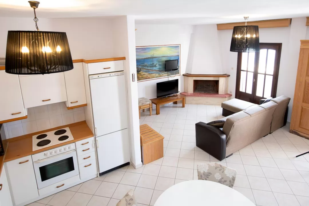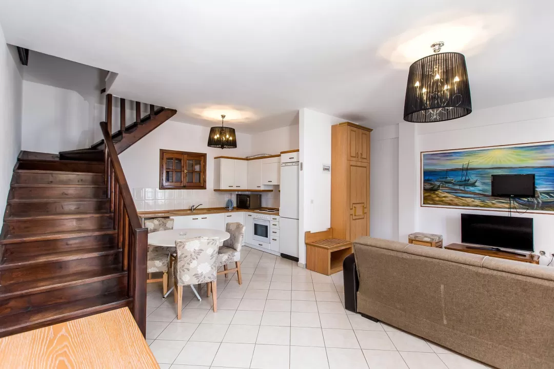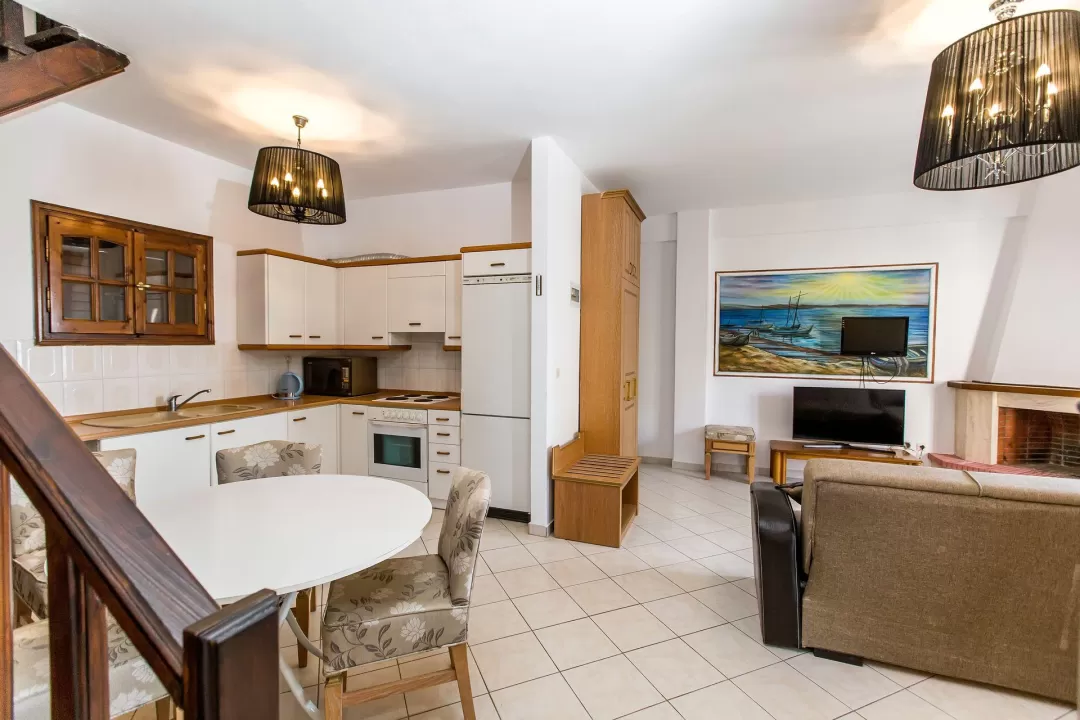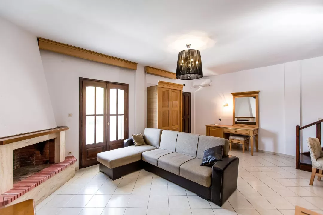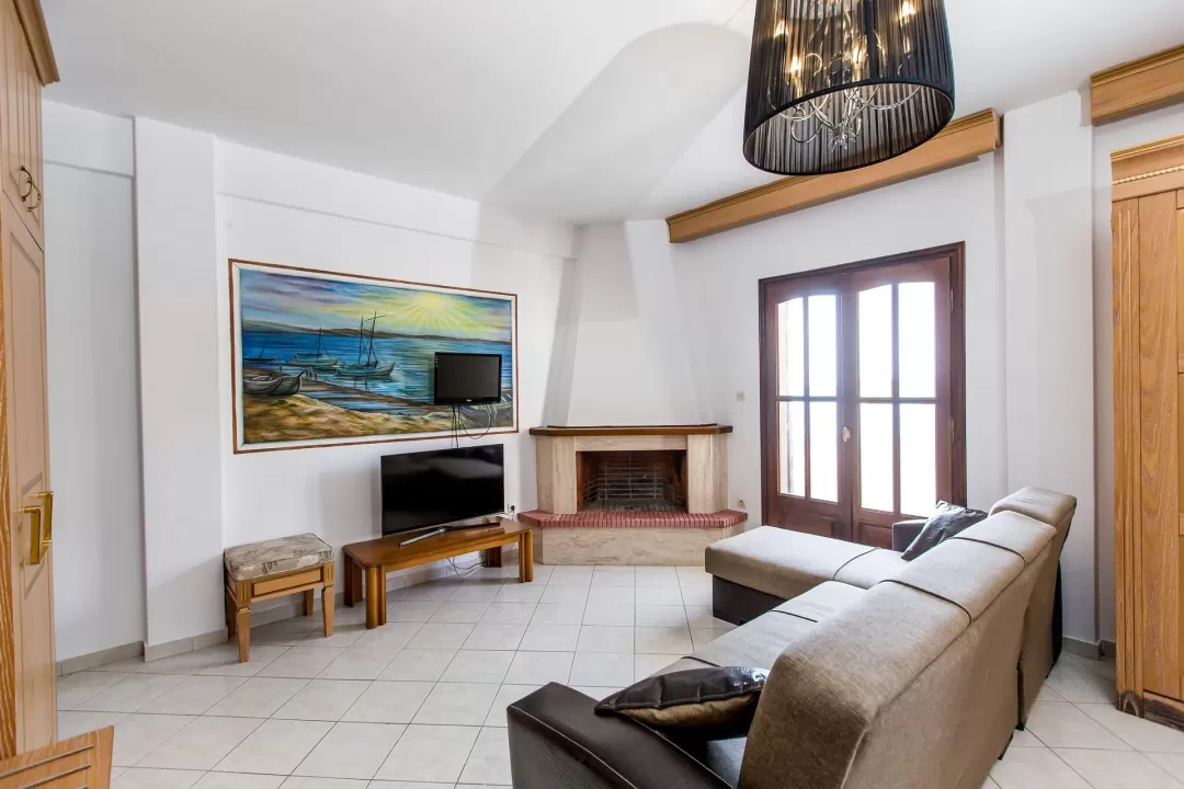 Ova rustična vila od 110 m² u stilu kuće na dva sprata, građena u tradicionalnoj arhitekturi, sa drvenim elementima. Na donjem spratu se nalazi dnevna soba sa potpuno opremljenom kuhinjom i pristupom verandi, kao i WC. Na drugom spratu se nalaze dve spavaće sobe, svaka sa svojim balkonom i kupatilom sa tuš kabinom. Vila je opremljena klima uređajem, TV-om, wi-fi. Maksimalni smeštaj je do 8 osoba. Grčka vila na plaži je savršen izbor za velike porodice sa decom ili grupe prijatelja. Gosti mogu koristiti sve sadržaje hotela i apartmana Greek Pride smeštenih na 300 m udaljenosti.