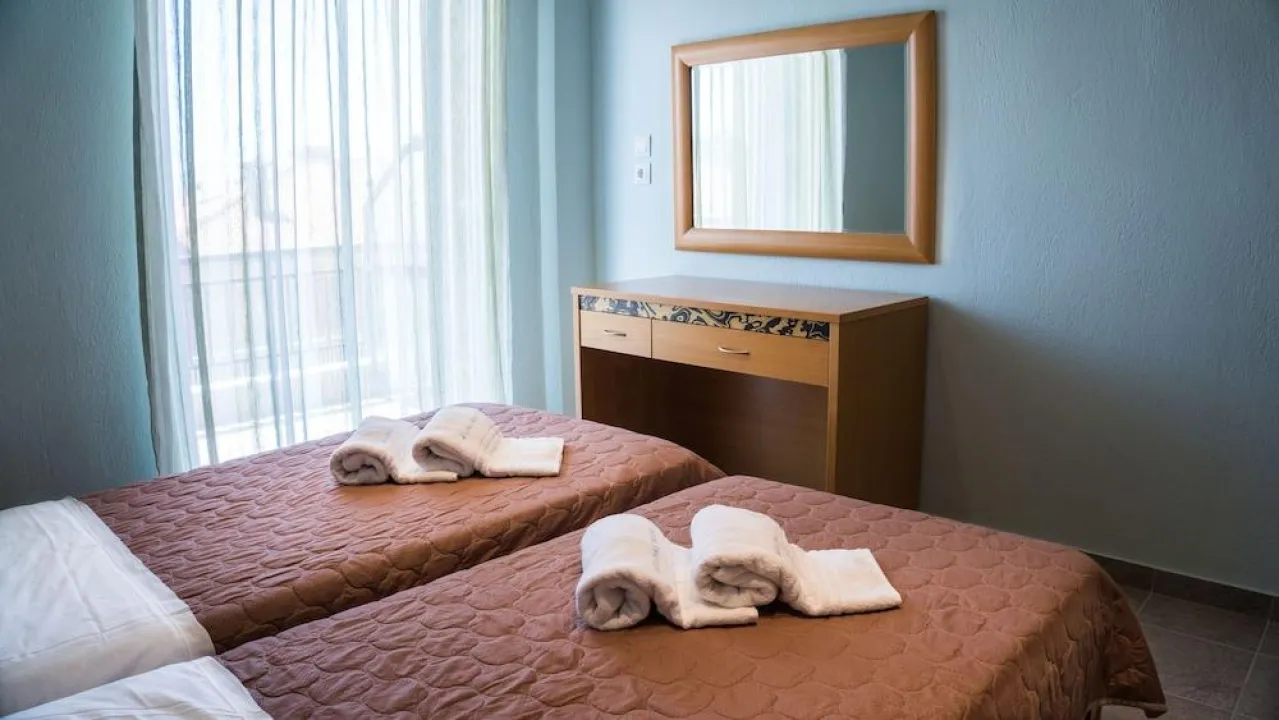 Sve sobe imaju klima uređaj i centralno grejanje. U pojedinim sobama gosti mogu uživati u pogledu na more sa balkona ili privatne terase. Sobe su opremljene francuskim ili king-size ležajem, a na zahtev su dostupni dodatni ležajevi. Standardna oprema uključuje frižider. Na raspolaganju su i telefon, televizor i bežični internet bez doplate. Kupatila nude izbor peškira kao dodatnu pogodnost. Objekat raspolaže porodičnim i sobama za nepušače.
