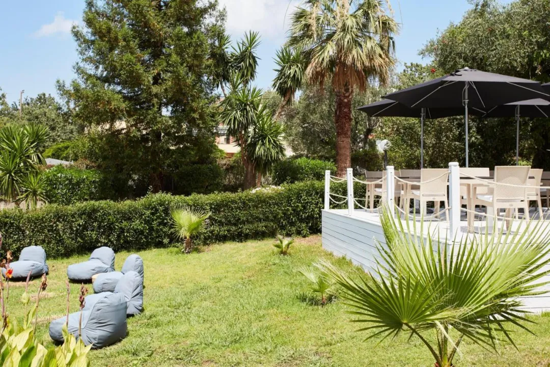 Mr & Mrs White Corfu je okružen prelepim zelenim vrtom od 18000 kvadratnih metara. Ovaj privlačan apartmanski hotel idealno je smešten u starom selu Aharavi, na severnom delu Korfu. Samo 150 m udaljen od centra i na samo 600 m udaljenosti od beskrajne peščane plaže Aharavi, objekat je blizu brojnih prodavnica, kafića, barova, tradicionalnih taverni i supermarketa. Čuveni Waterland je na pešačkoj udaljenosti od obejkta.